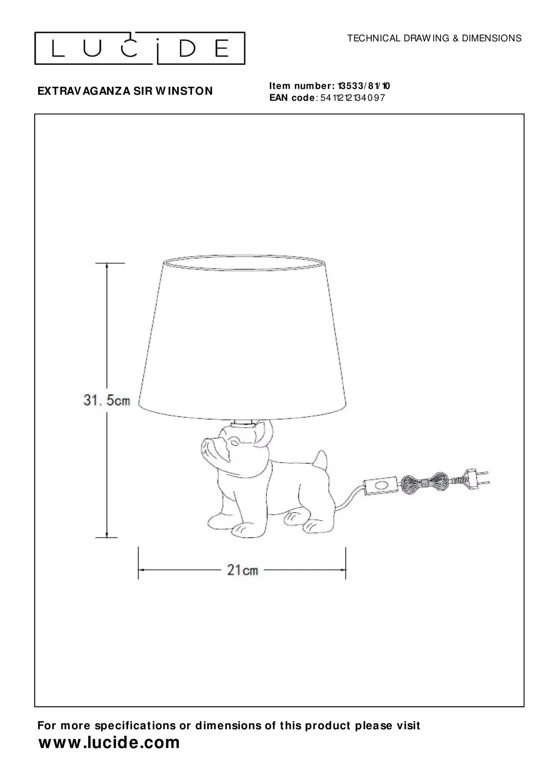 Une lampe de table rétro ayant pour base un bouledogue robuste adorable à souhait. Extravaganza Sir Winston combine sans effort classe et kitsch. Le bulldog est fabriqué à partir de porcelaine de haute qualité. Le point de lumière, entouré d’un abat-jour en lin, s’élève au-dessus de sa tête, au sommet d’une tige. Ce cylindre assure une diffusion uniforme de la lumière, idéale pour créer une atmosphère chaleureuse. Des pieds jusqu’au sommet de l’abat-jour, Sir Winston mesure 31,5 centimètres. Une lampe compacte qui se sent chez elle partout dans la maison. Une valeur ajoutée décorative simple et rapide.