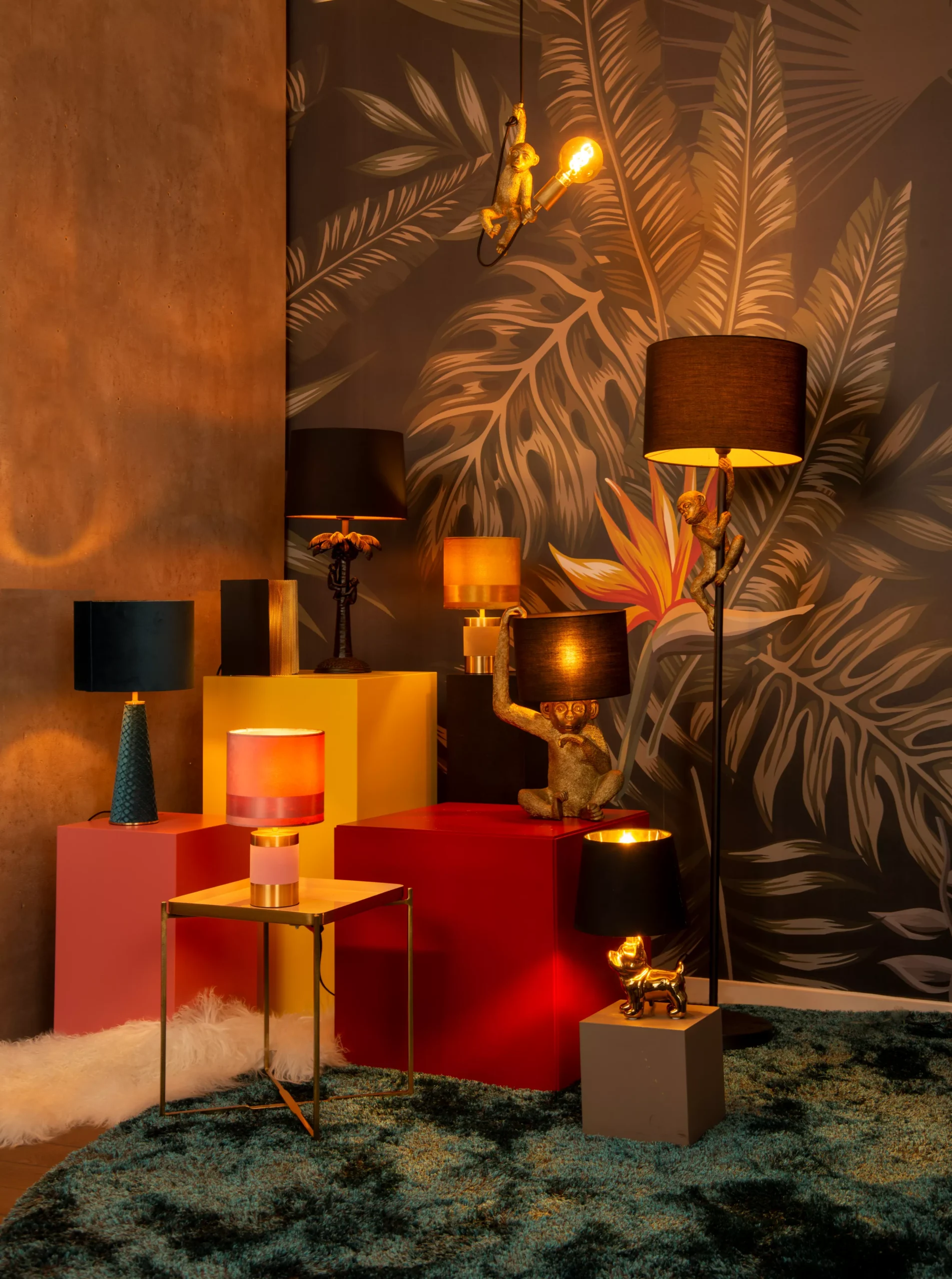 « Chapeau bas », semble dire cette lampe de table. Le chimpanzé en plastique – l’élément ludique de Extravaganza Chimp – tient l’abat-jour en coton sur sa tête. Une main sous le menton et les yeux grand ouverts, il adopte une mimique laissant entrevoir un certain émerveillement. Vous avez allumé la lampe de table à l’aide de l’interrupteur situé sur le cordon ? Vous remarquerez qu’en plus de la lampe principale, une lampe figurative semble également s’allumer. Comme si une nouvelle idée jaillissait à chaque allumage.