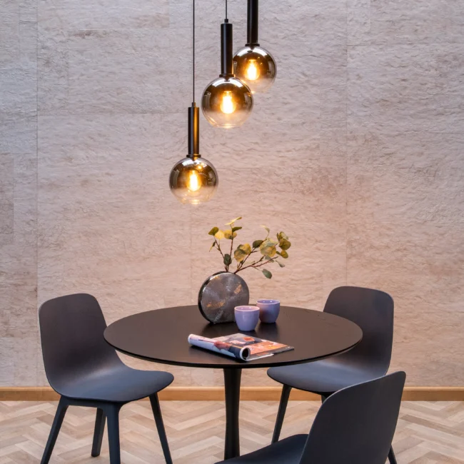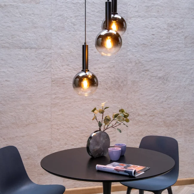 Apportez toute la grandeur d’un salon confortable ou d’un restaurant branché dans votre maison. En termes d’atmosphère et de convivialité, Marius est sûr de plaire. Cette lampe suspendue comprend trois sources lumineuses en verre fumé. Les ampoules en verre peuvent être suspendues à différentes hauteurs pour un effet optique optimal. Grâce à la finesse du câblage, les sources de lumière attirent toute l’attention. Cette lampe suspendue s’intègre parfaitement dans votre salon ou votre salle à manger.