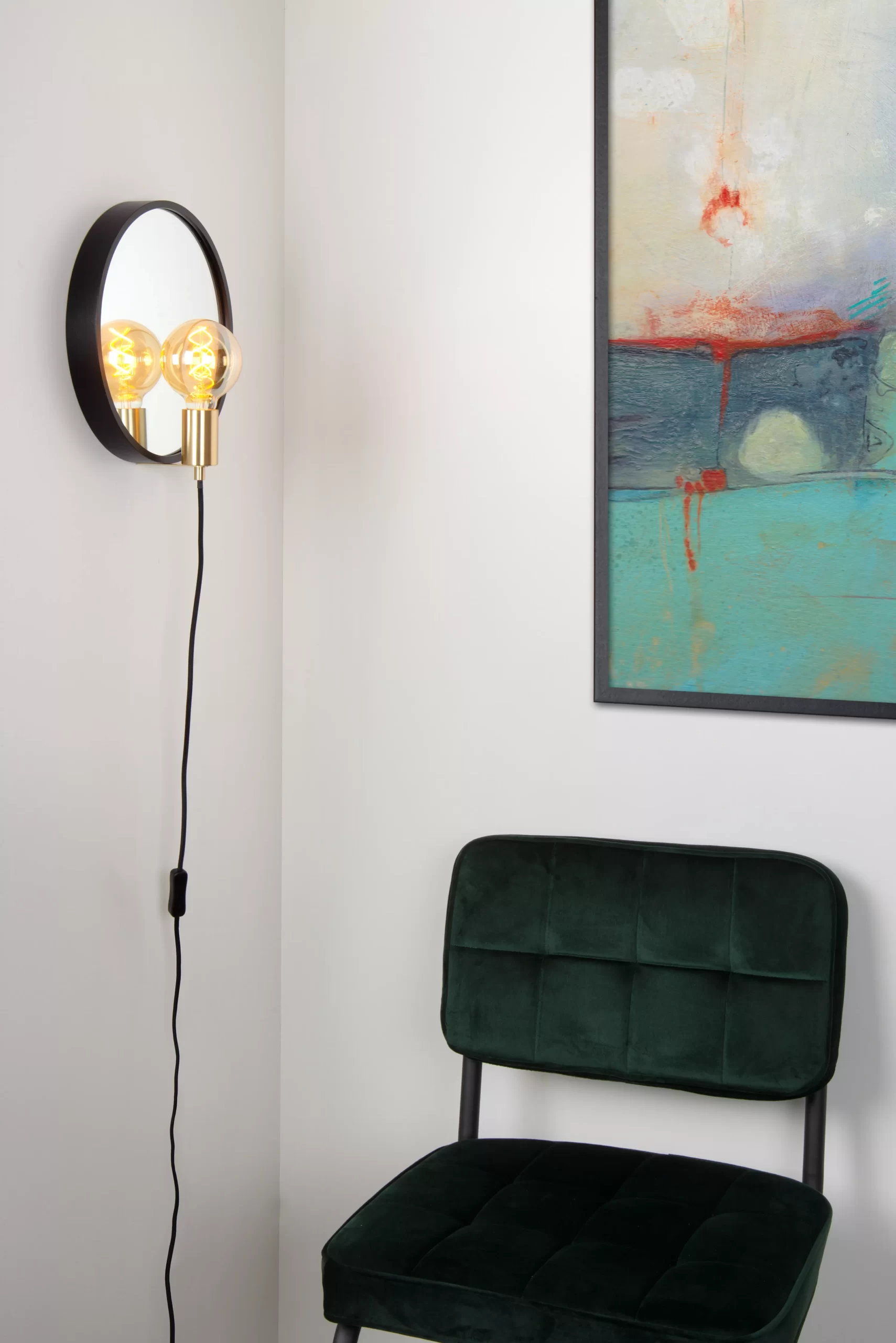Reflex, le nom le dit. La source lumineuse et le socle peuvent facilement admirer leur propre reflet dans le miroir situé derrière. De cette façon, cette applique murale réfléchit également la lumière dans la pièce. Cette lampe miroir est un joli accroche-l’œil en bois pour une touche très chaleureuse. Le miroir a un diamètre de 31 centimètres et le luminaire complet a une épaisseur de 21 centimètres. Un format compact, idéal pour les intérieurs scandinaves, modernes ou ruraux. Vous pouvez facilement allumer et éteindre la lampe avec son interrupteur.